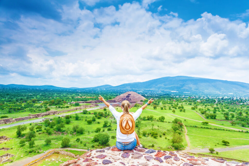 Parte posterior de la mujer sentada con las manos levantadas en la cima de las montañas y disfrutando de la pirámide mexicana de Teotihuacán, el concepto de viajes y turismo