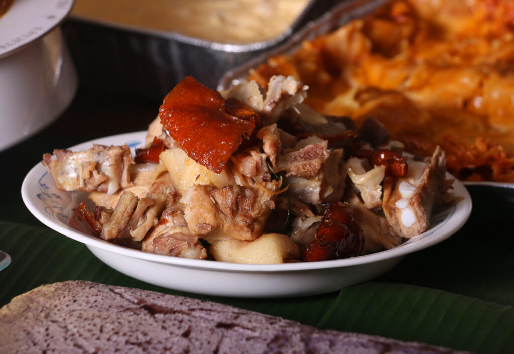 Partes cortadas de Lechon o Cerdo Suckling que es el plato nacional de Filipinas y Puerto Rico. Tiene sus raíces en España y en los países latinoamericanos, donde se suele preparar durante los festivales.
