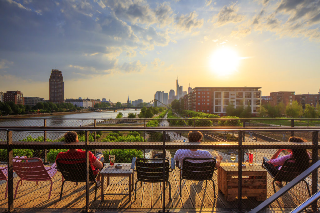 People enjoying sunset at Das Oosten Realwirtschaft am Main restaurant and the financial district in the background ID: 22889