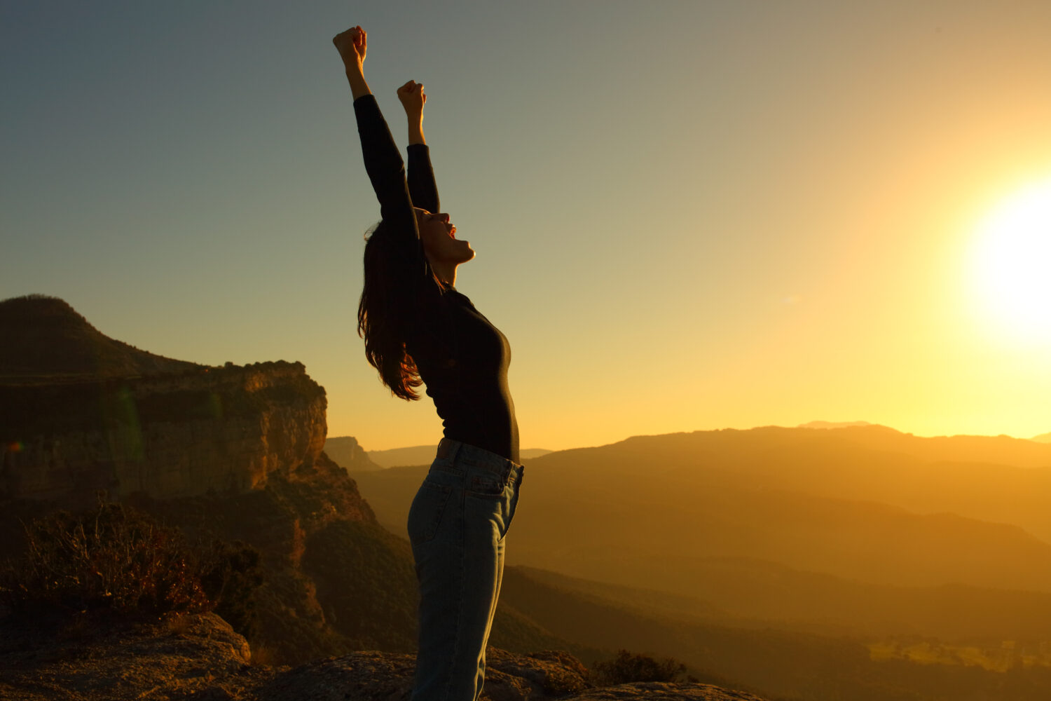 Perfil de la silueta de una mujer gritando levantando brazos celebrando las vacaciones al atardecer en la montaña