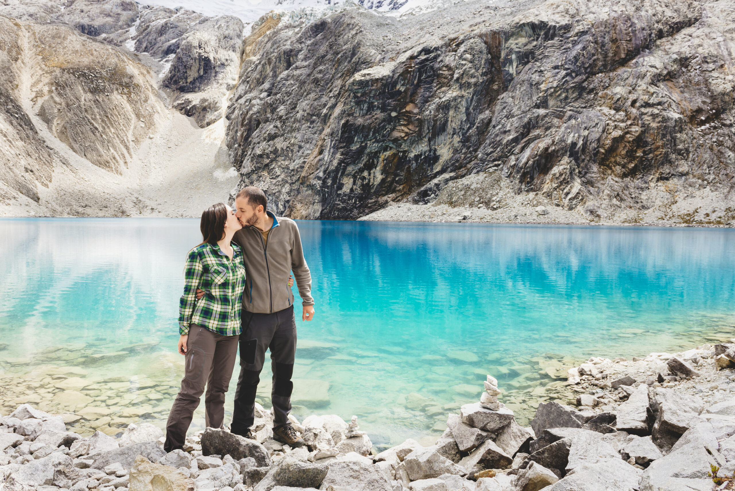 Peru, Cordillera Blanca, Huaraz, Huascaran National Park, couple kissing at Laguna 69