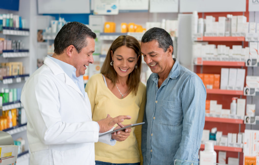 Pharmacist showing app to a couple of customers at a drugstore using a tablet computer and looking happy