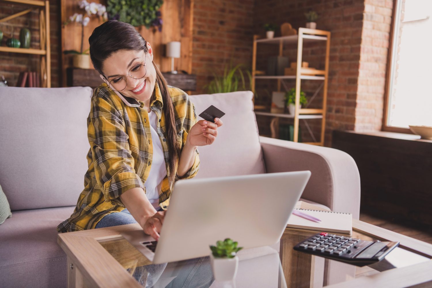 Photo of happy positive cheerful woman talk phone hold credit card finance boss indoors inside house home
