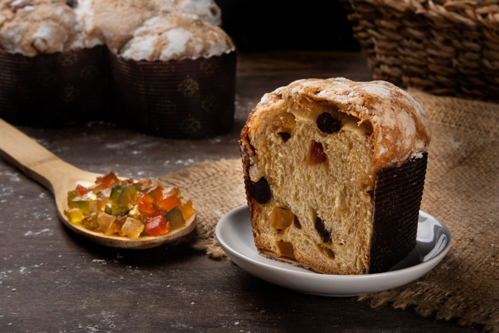 Piece of Easter dove bread (colomba Pasquale) on a white plate made with candied fruit and wheat on a rustic wooden table ID: 31744