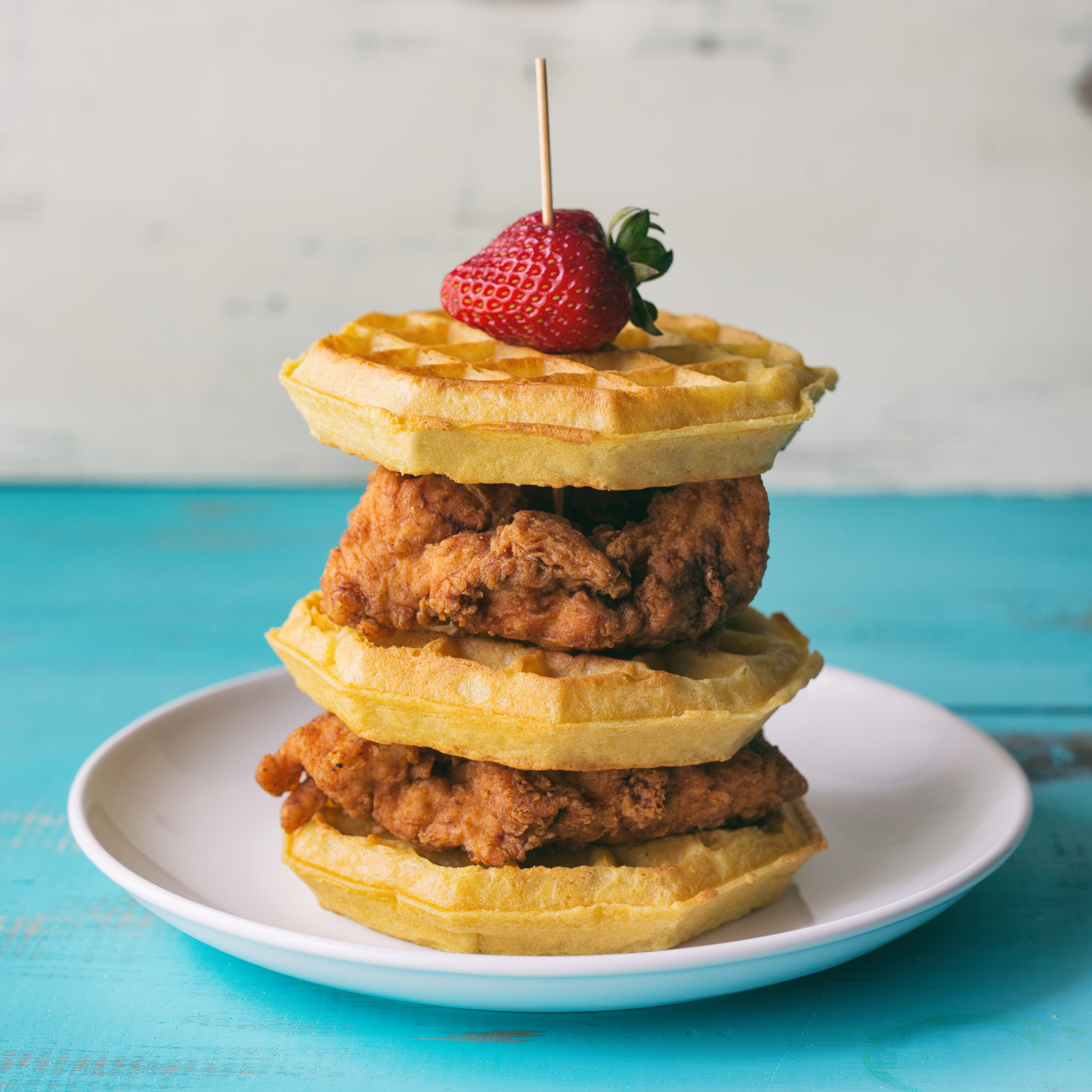 pieza alta de pollo y gofres con aderezo de fresa ID: 88872 Pieza alta de pollo y gofres con aderezo de fresa.