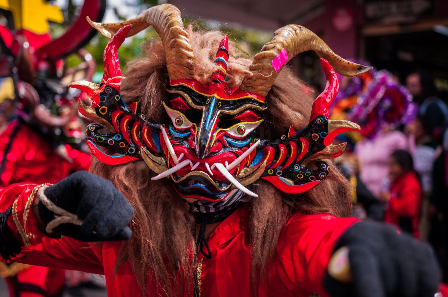 PILLARO, ECUADOR 3 DE ENERO DE 2020: Persona enmascarada roja en el Festival Diablada o del Diablo
