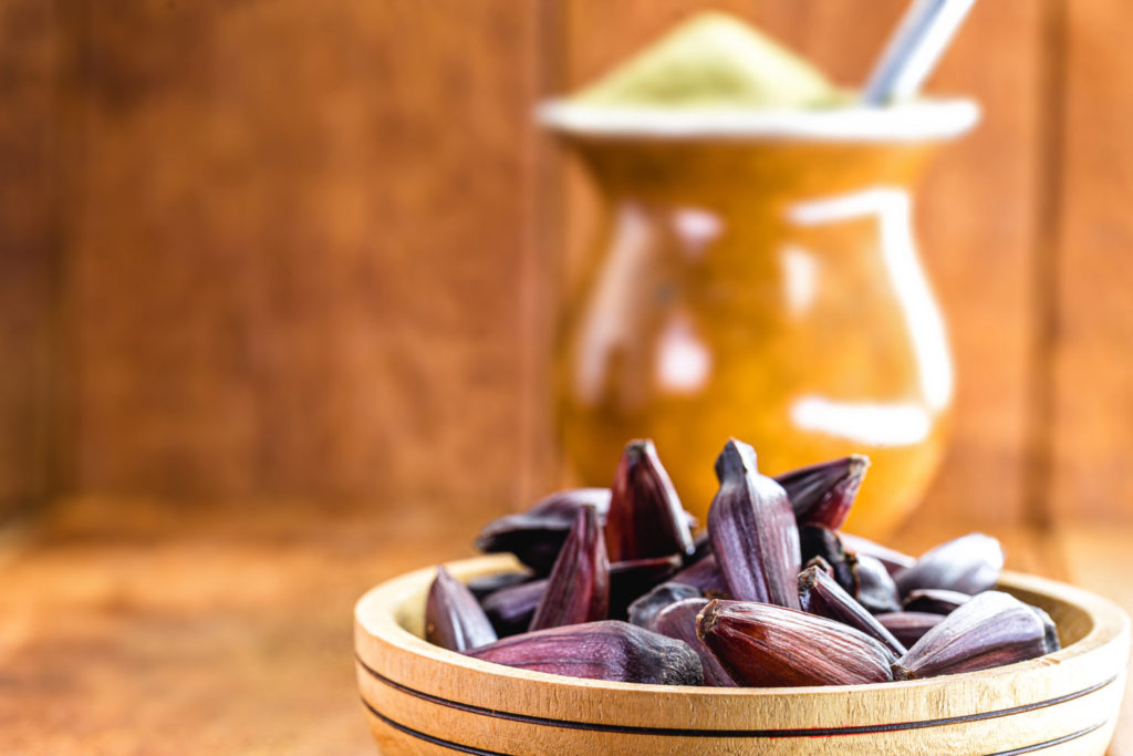 Pinion bowl with chimarrão in the background, spot focus. Typical drink and food from Rio Grande do Sul, Brazil.