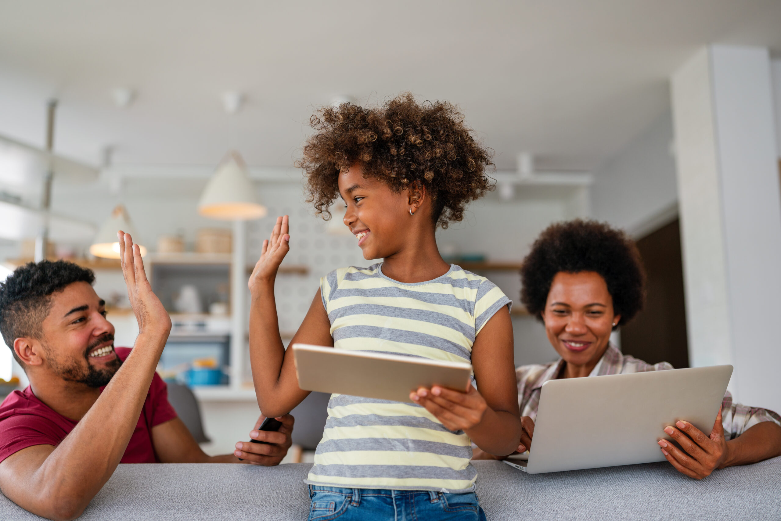 Planning vacation together. Happy african american father, mother and daughter using digital device at home, Happiness technology people concept.