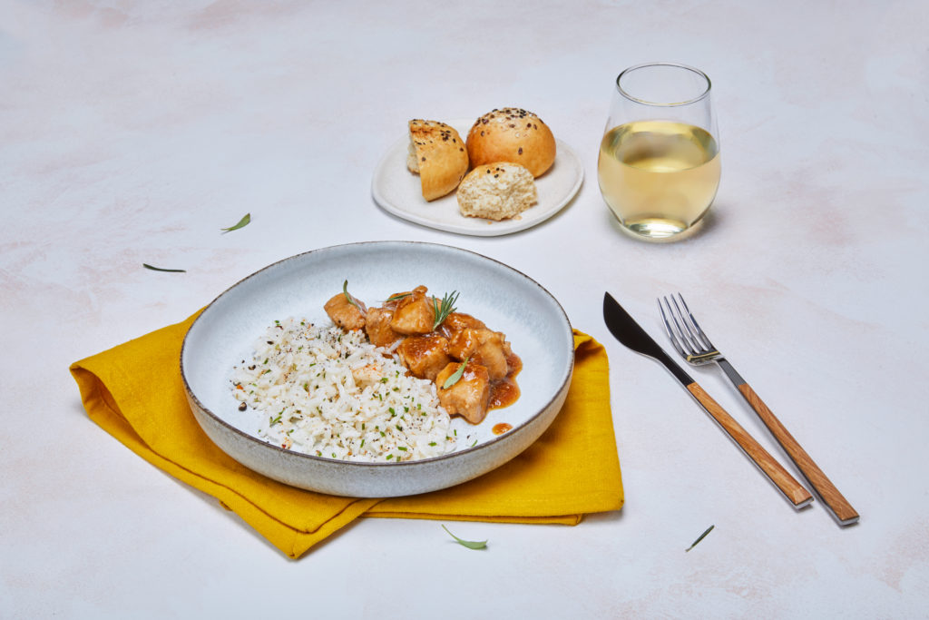 Plato Economy Class. Pollo al curry con arroz, pan y vino blanco.