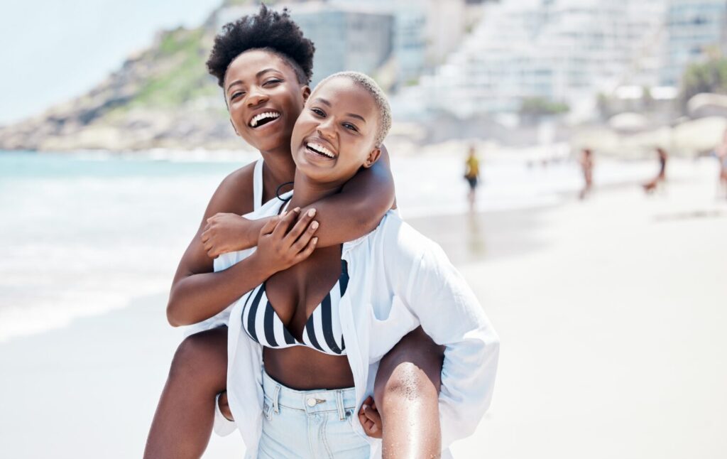 Playa, mujer negra y amigas divertidas cargando por mar, agua del océano o fondo natural en vacaciones de verano en Miami, Florida. Retrato de sonrisa, mujeres felices y personas cómicas en libertad y bikini en viajes