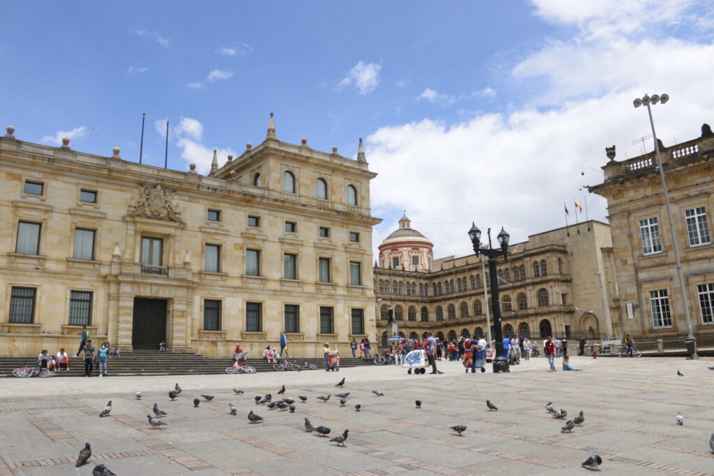 Plaza del centro de Bogotá con palomas un domingo por la mañana con gente