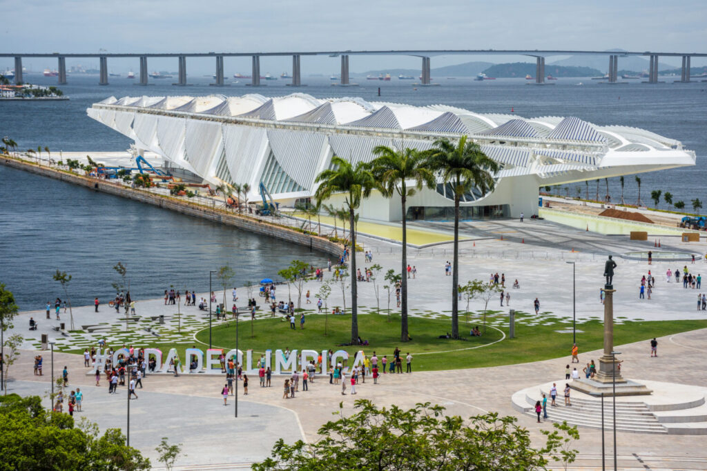 Plaza Maua y el nuevo Museo del Mañana visto desde la terraza del MAR (Museo de Arte de Río) en Río de Janeiro, Brasil