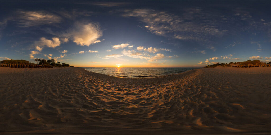 Plena panorámica equirectangula de 360 grados frente al mar en la playa