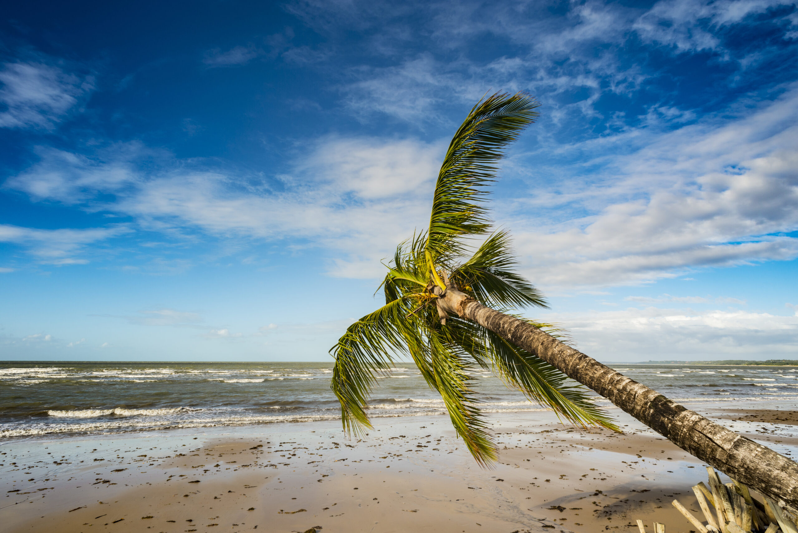 View of a palm tree knocked down on the beach at ‘Praia de Taperapuã’ in Porto Seguro, Bahia state – Brazil