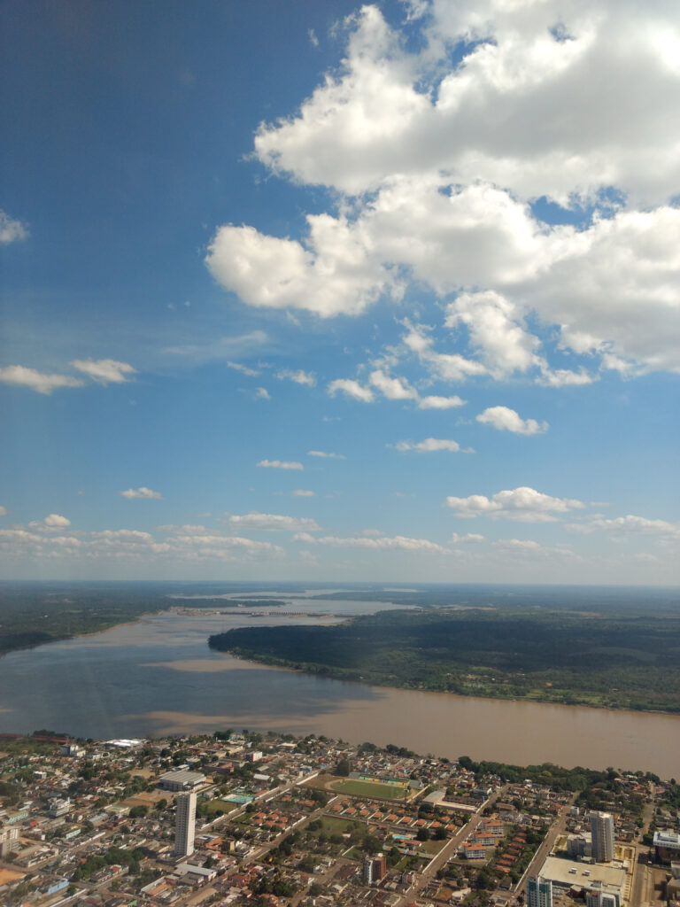 Porto Velho, which is strategically located at the banks of the Madeira river on its limits of navigable waterways, now has to deal with the effects of a hydroelectric power plant built on the rocks a couple of kilometres upstream. It is one of the most recent projects, and already in operation. With the airport located within the city limits, one can see the city centre, the Madeira river and the Jirau hydroelectric power plant on a clear day.