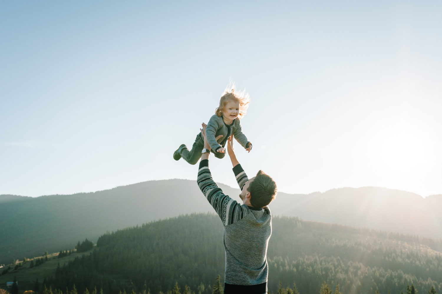 portrait of a father holds throws up happy daughter on