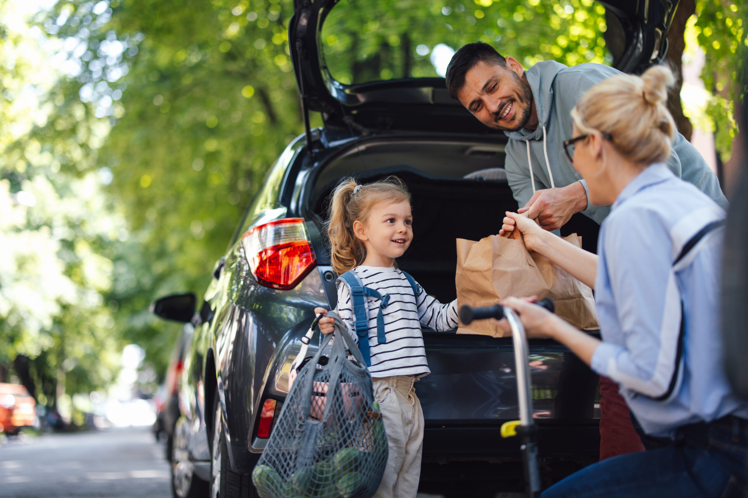 Close up shot of a cute girl looking up at her mother while her father is packing things in the back of the car preparing to go on a car ride to the park. She is holding a bag.