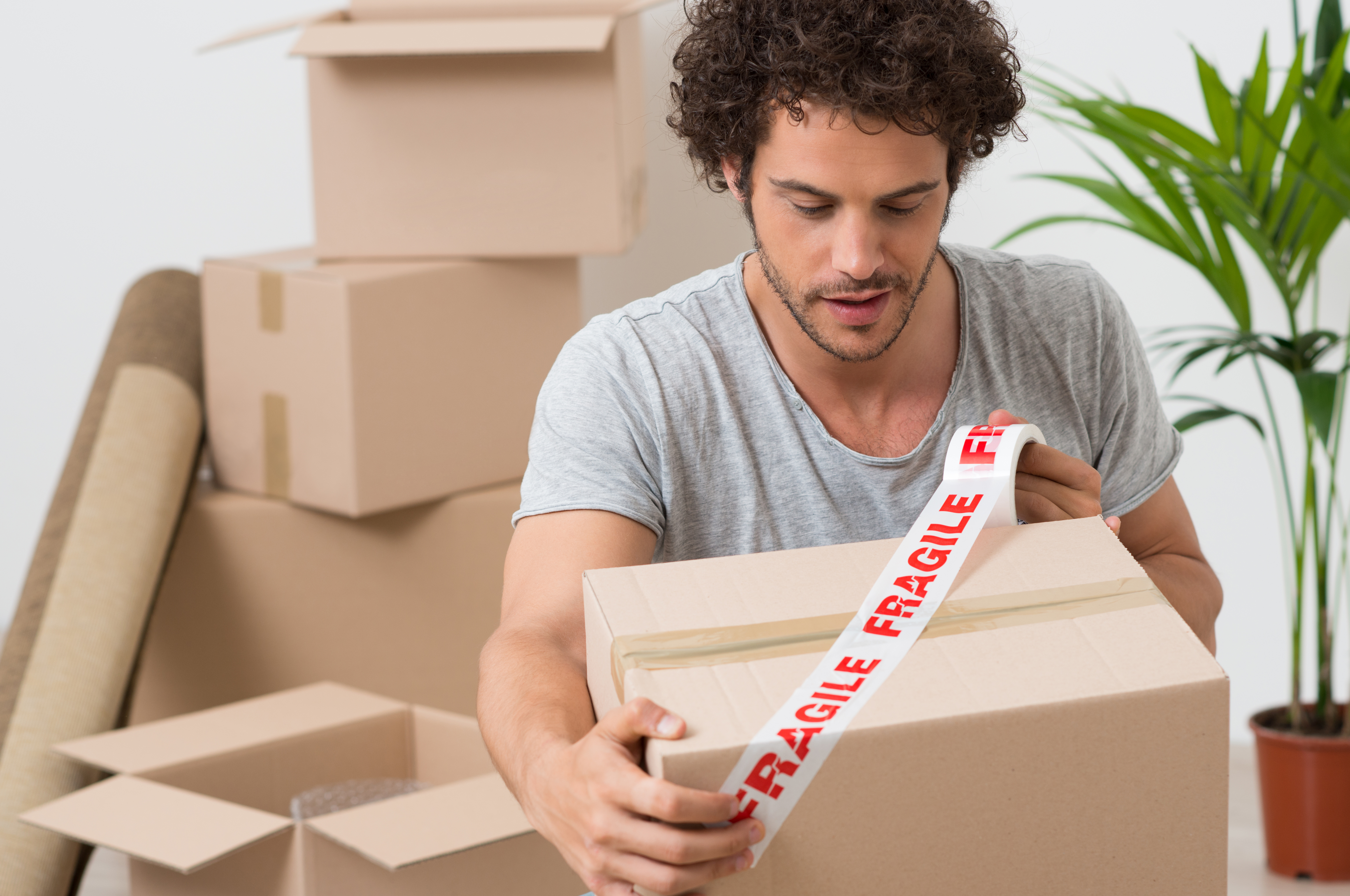 Portrait Of A Young Man Packing Cardboard Box With Fragile Sellotape