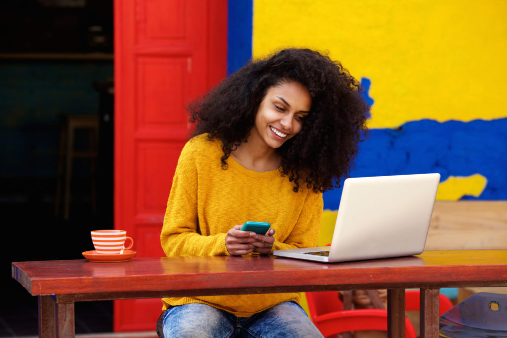 Portrait of attractive young black woman with mobile phone looking at her laptop at outdoor cafe