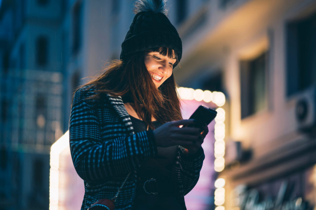 Portrait of brunette woman looking at smartphone at night – Madrid Spain