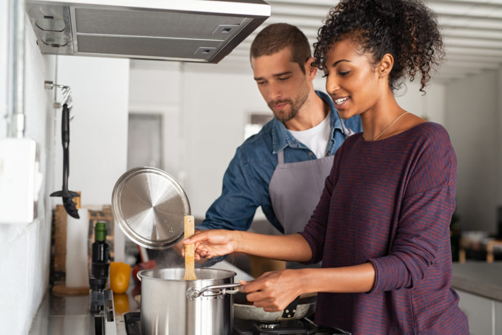 Portrait of happy young couple cooking together in kitchen at home. Woman cooking in pot with her boyfriend in kitchen. Man in apron helping his girlfriend preparing dinner.