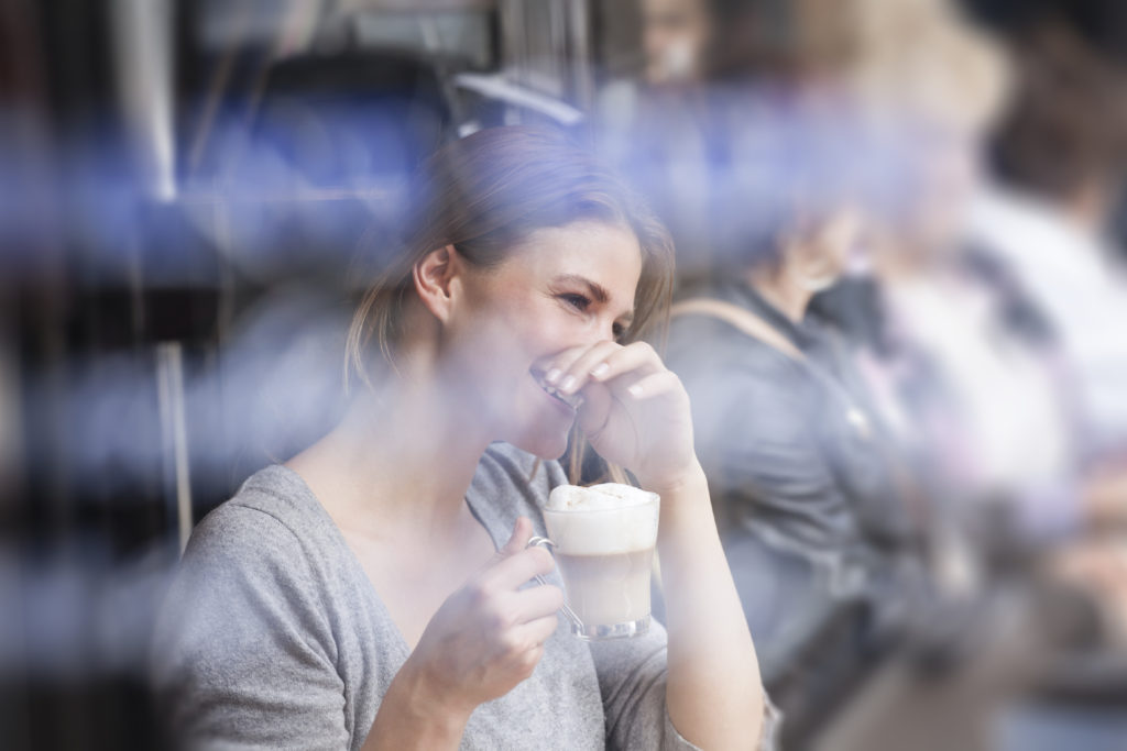 Portrait of laughing young woman drinking milk coffee in a cafe