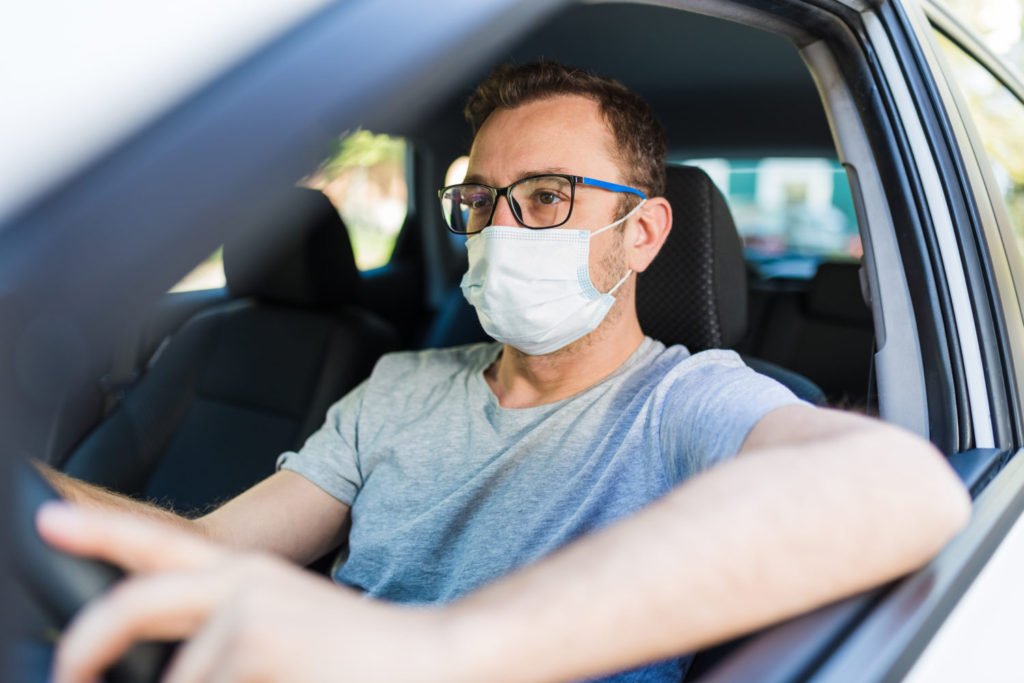 portrait of man wearing surgical mask while driving a car ID: 33218 Portrait of man wearing surgical mask while driving a car.