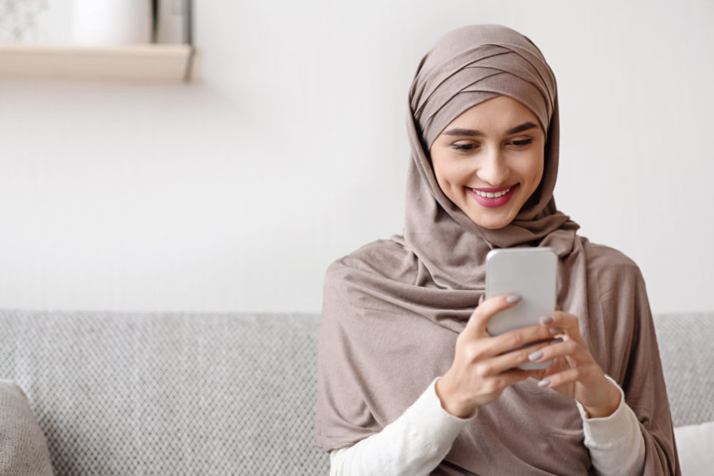 Portrait of millennial muslim girl in hijab using smartphone at home, messaging or browsing social networks, sitting on sofa in living room