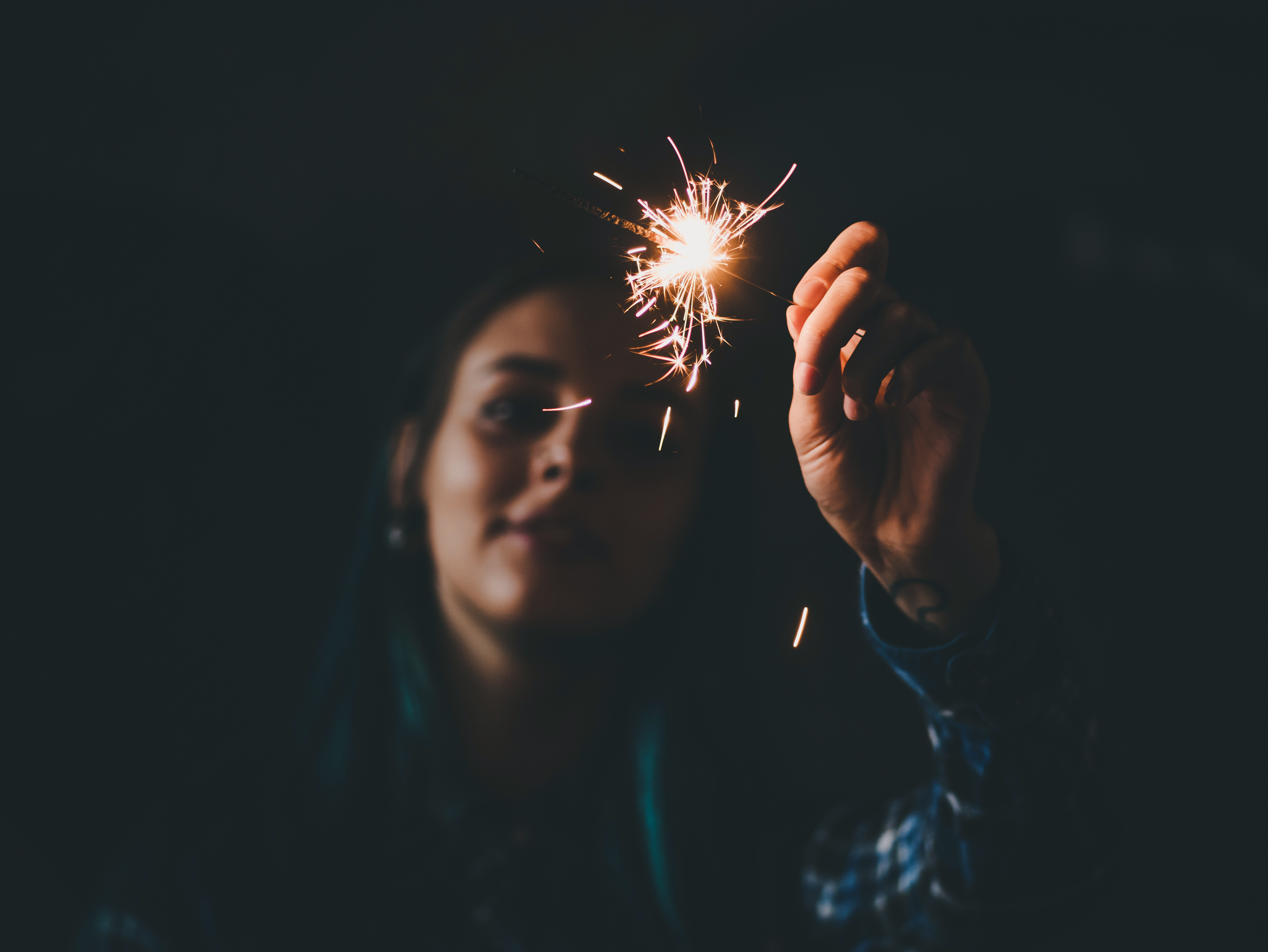 Portrait of model girl with blue hair looks with sparklers in their hands. Close up. Beautiful young teenage in city tunnel having fun with bengal fire.