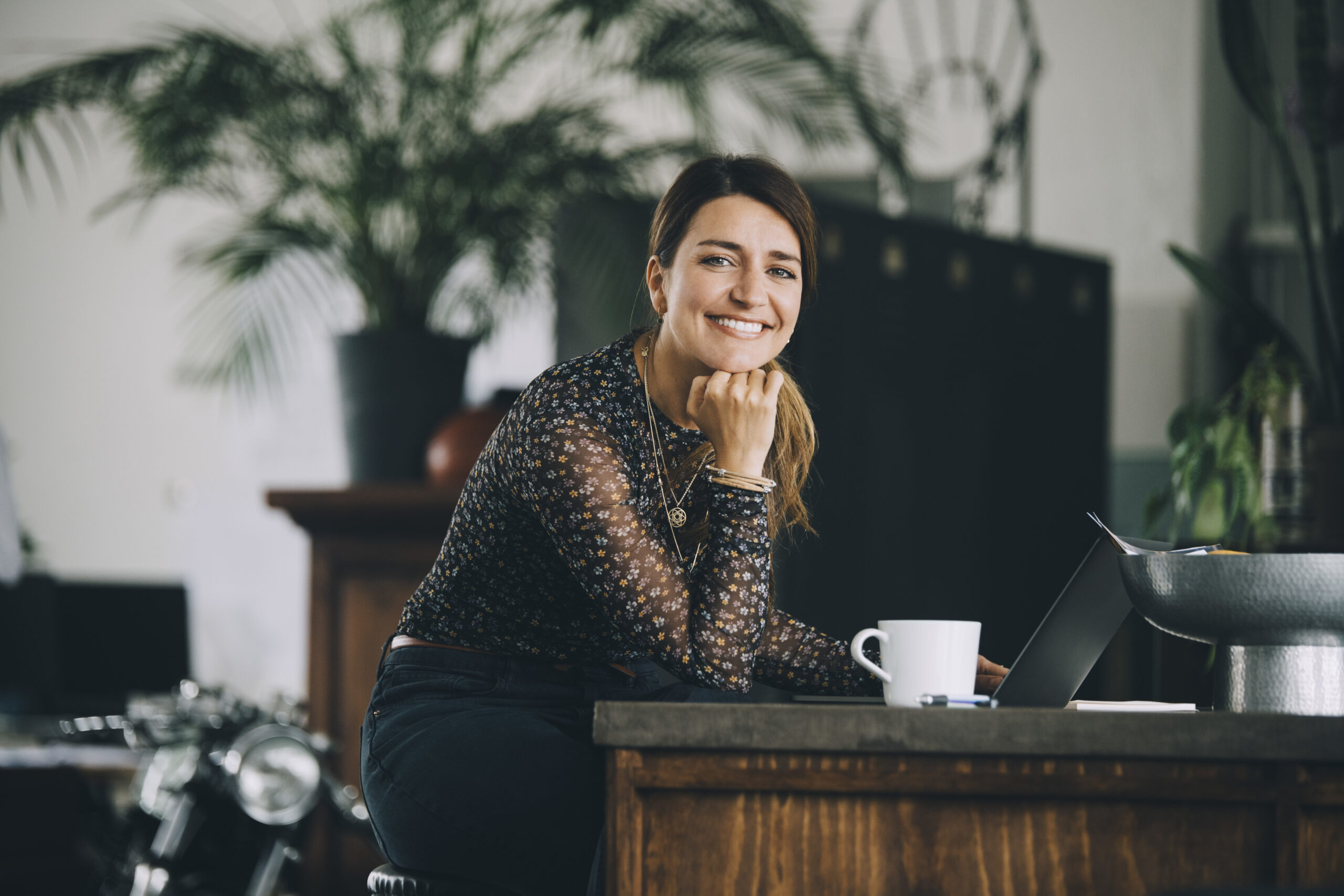 Portrait of smiling businesswoman with hand on chin sitting at kitchen island in creative office ID: 76410 -1