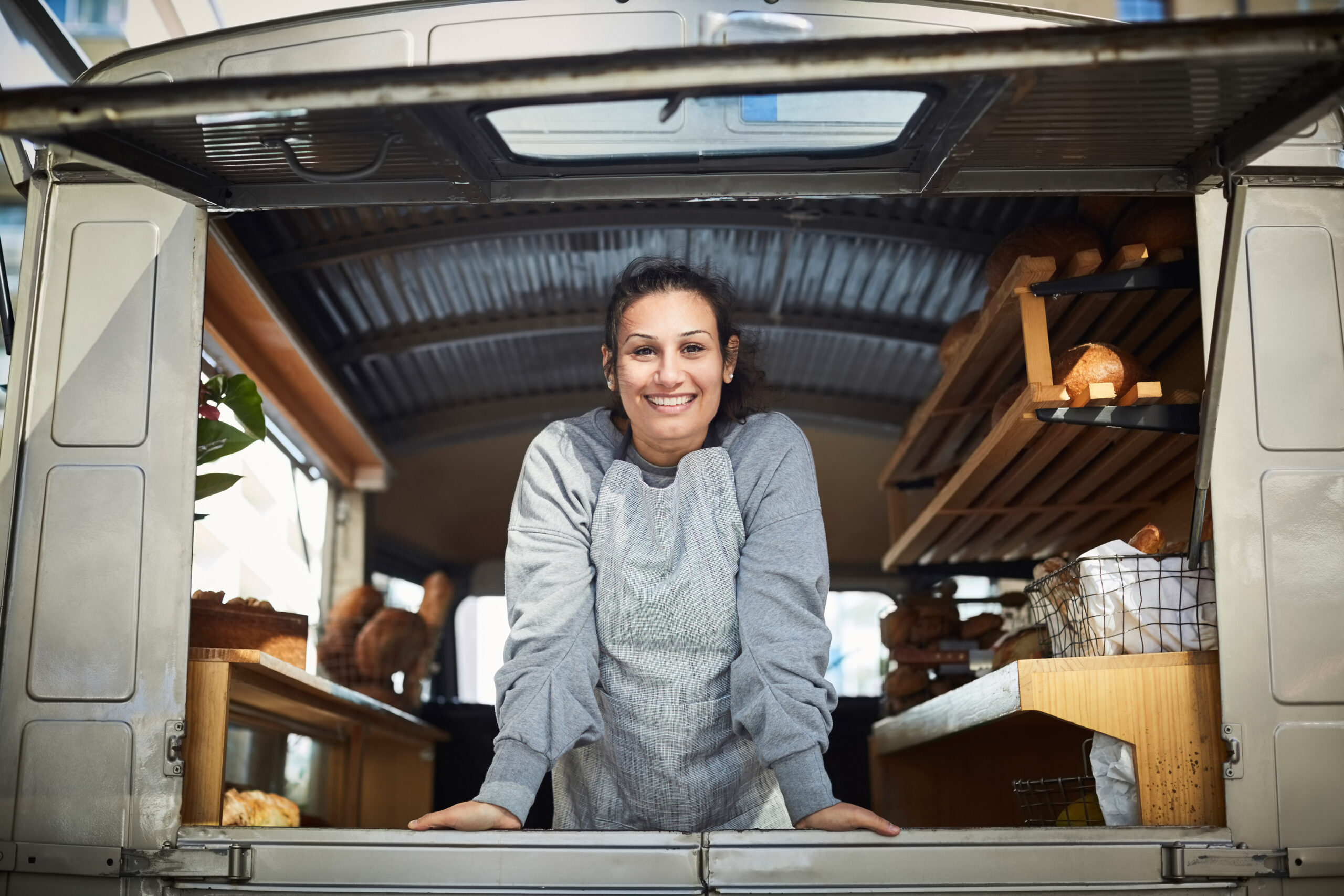 Portrait of smiling mid adult owner standing in food truck