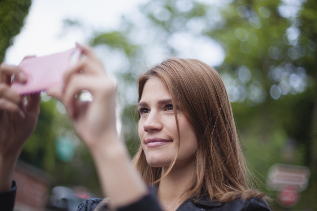 Portrait of smiling young photographing with her smartphone