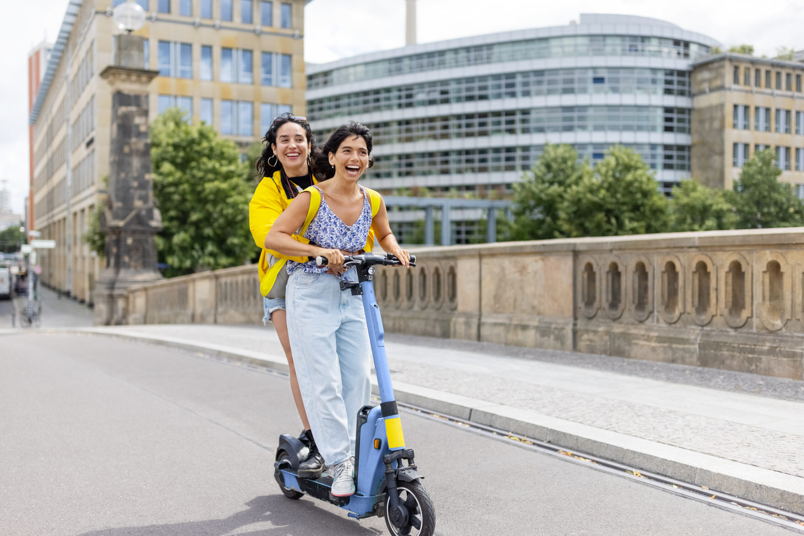Portrait of two cheerful women friends on holiday having fun on push scooter in city. Female tourists riding on an electric push scooter on vacation.