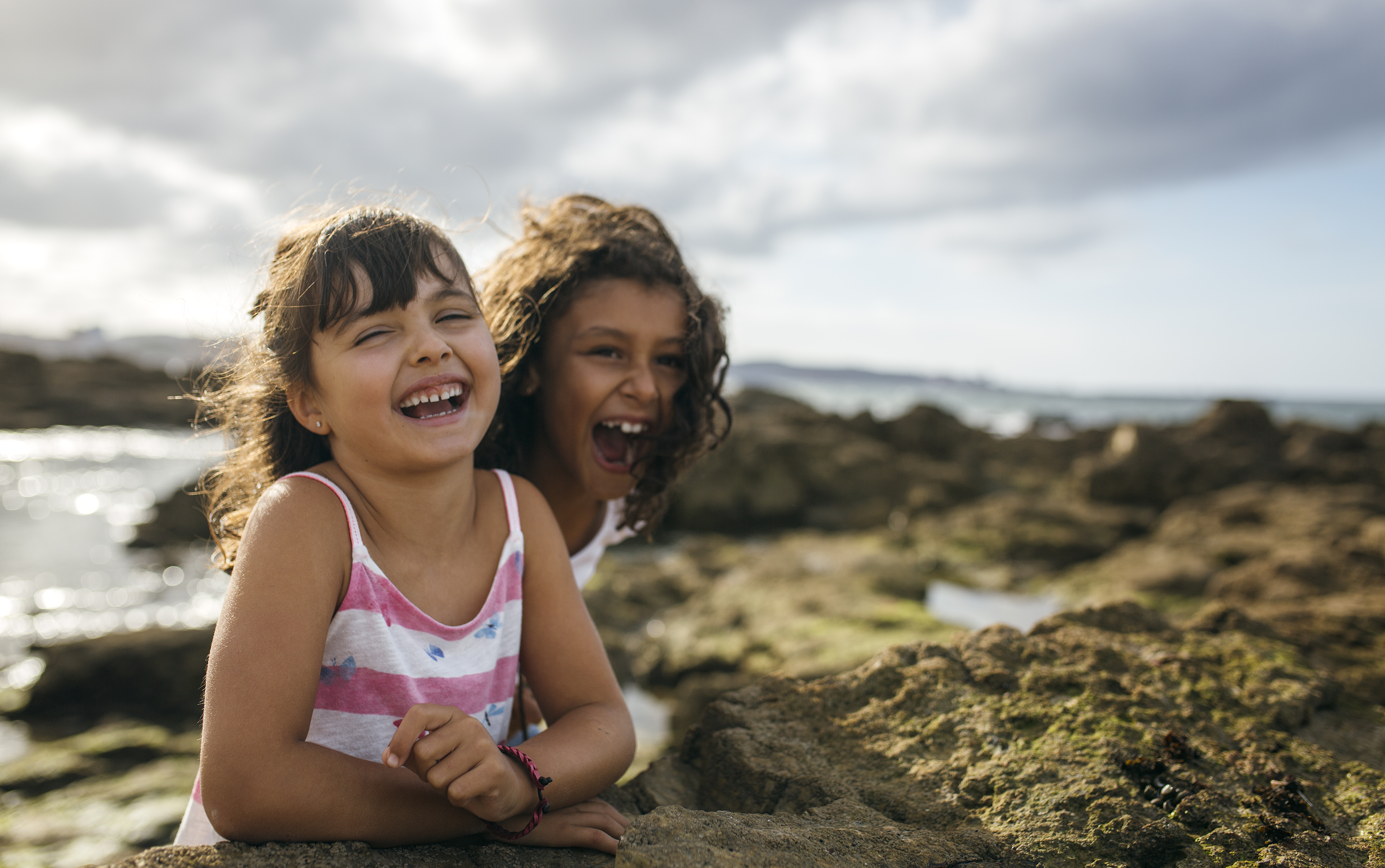• Portrait of two laughing little girls at rocky coast