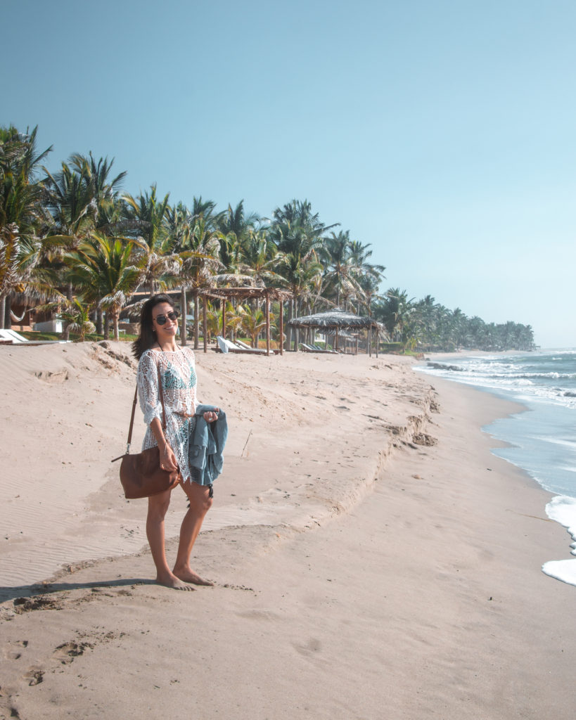 Portrait Of Woman Standing At Beach Against Blue Sky
