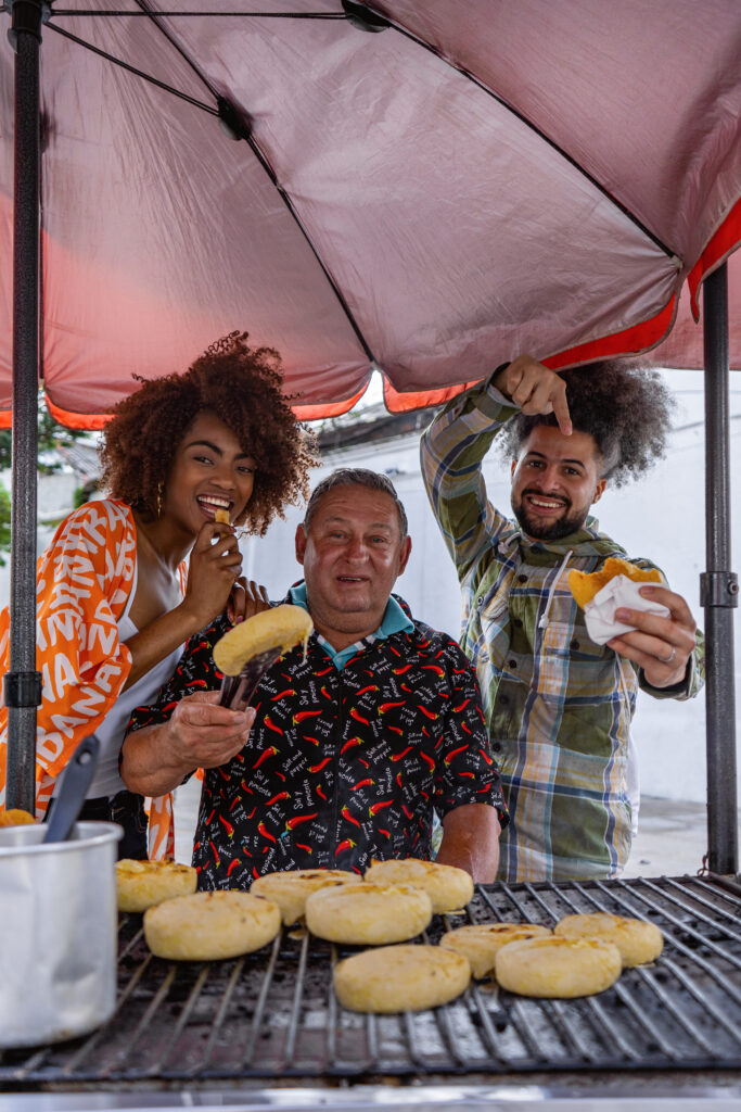 Portrait of young friends buying arepas on the city streets from a street vendor while looking at the camera.