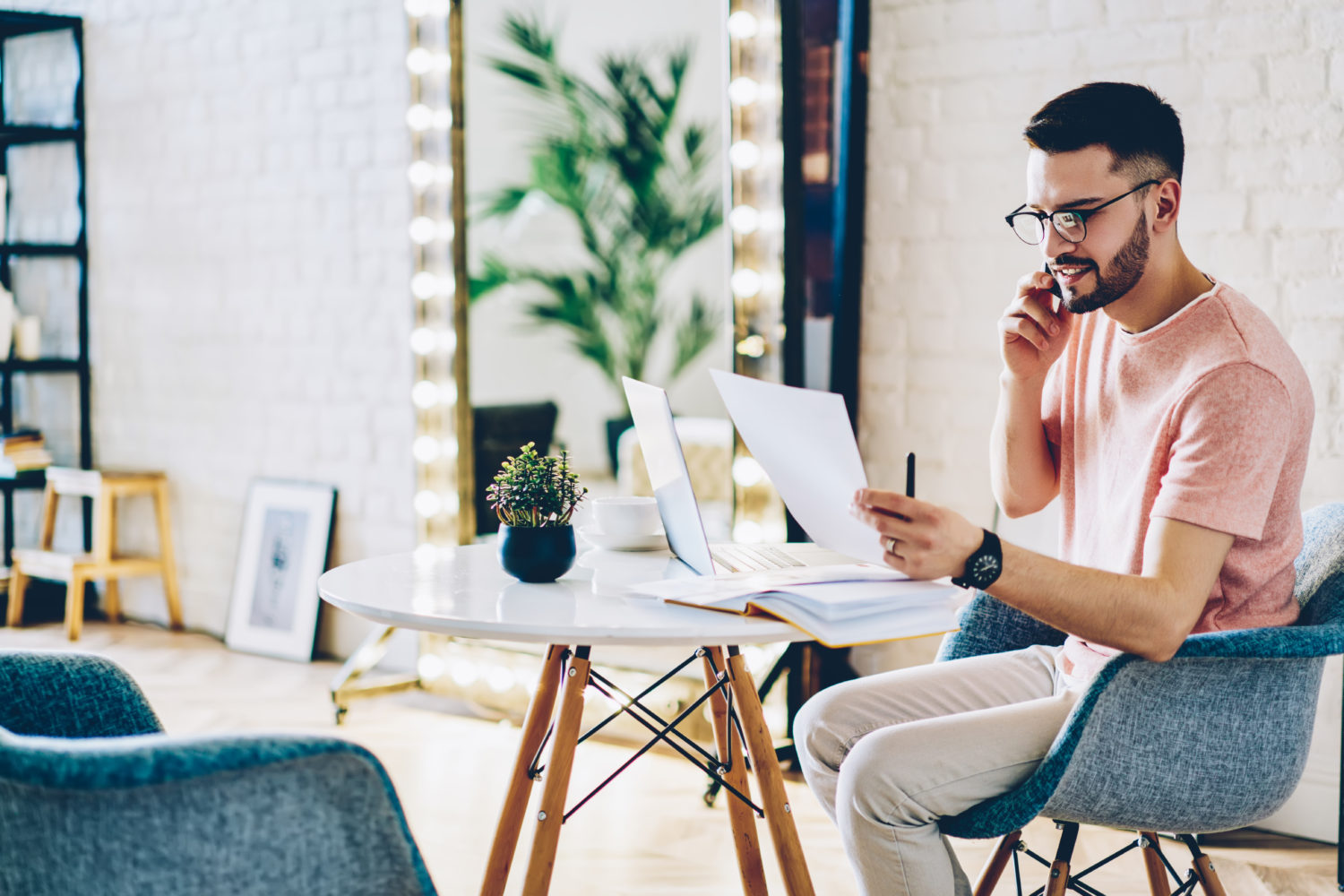 Positive man in optical eyewear working remotely with paper documents calling to colleague for consultancy about finance side using 4g internet on modern smartphone gadget sitting at home table