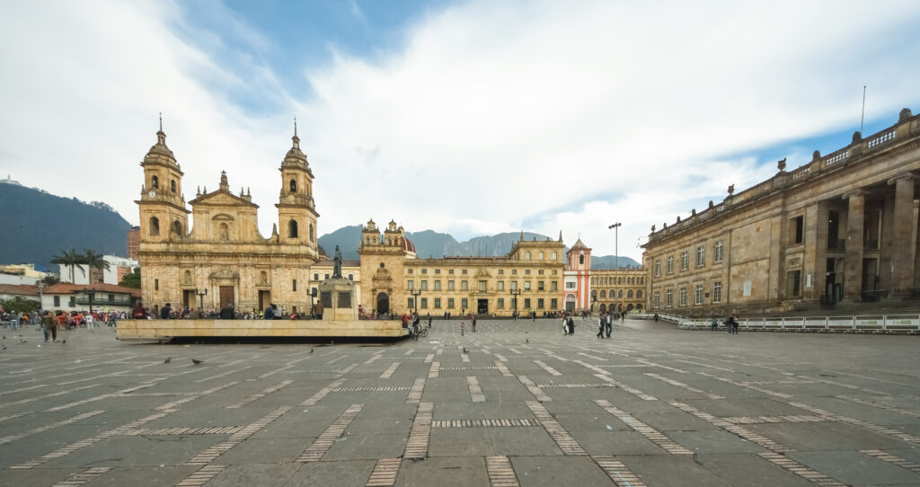 Primatial Cathedral of Bogotá on Bolivar Square of Bogota with Capitolio Nacional on the right hand side in Bogota, Colombia