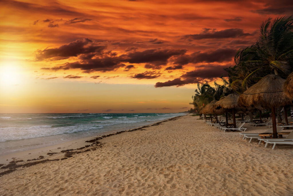 Puesta de sol dorada sobre la playa de la Riviera Maya en Tulum, Quintana Roo, México