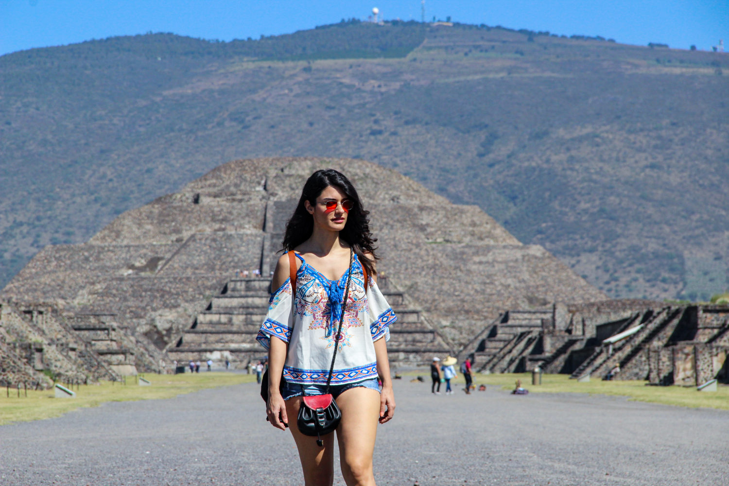 pyramid of moon teotihuacan background behind walking woman in mecixo
