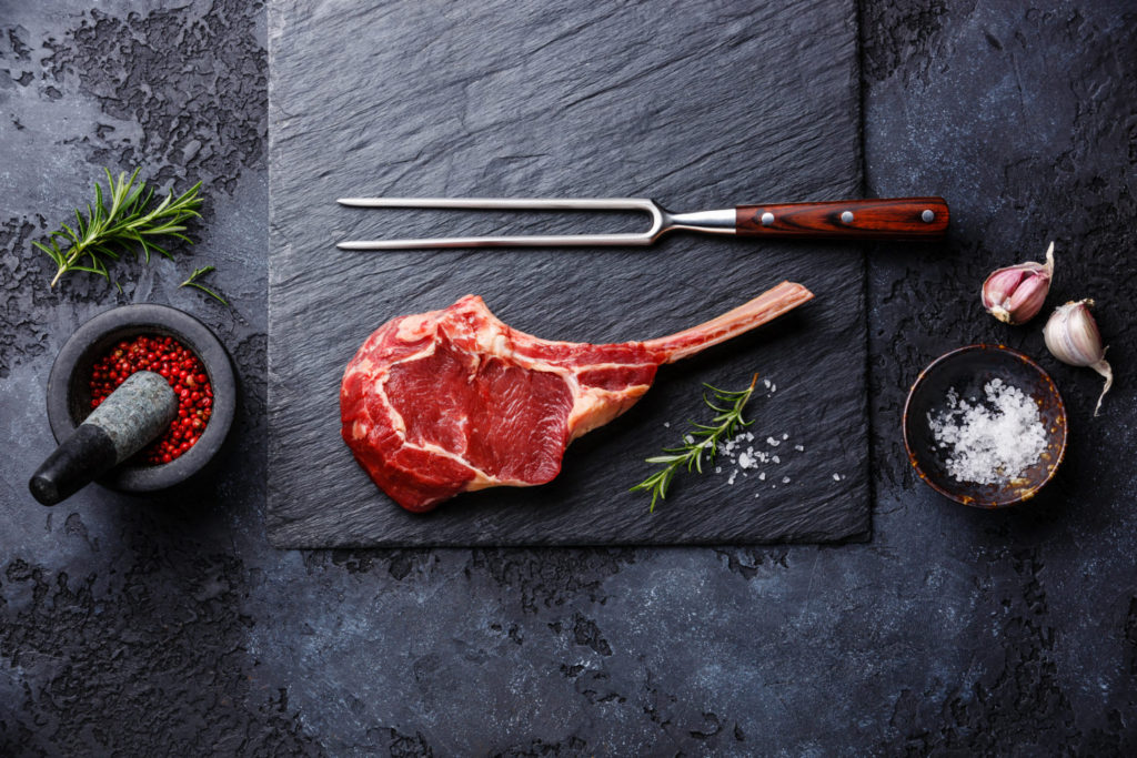 raw fresh meat veal rib steak on bone and seasonings ID: 41442 Raw fresh meat Veal rib Steak on bone and seasonings on dark background