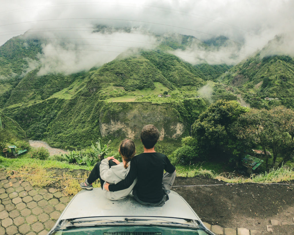 Rear View Of Couple Looking At Mountain While Sitting On Car