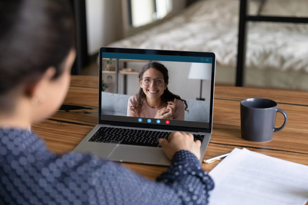 Rear view of female worker talk speak chat on video call on laptop with smiling colleague coworker. Women employees have webcam digital conference on computer, brainstorm on online meeting at home.