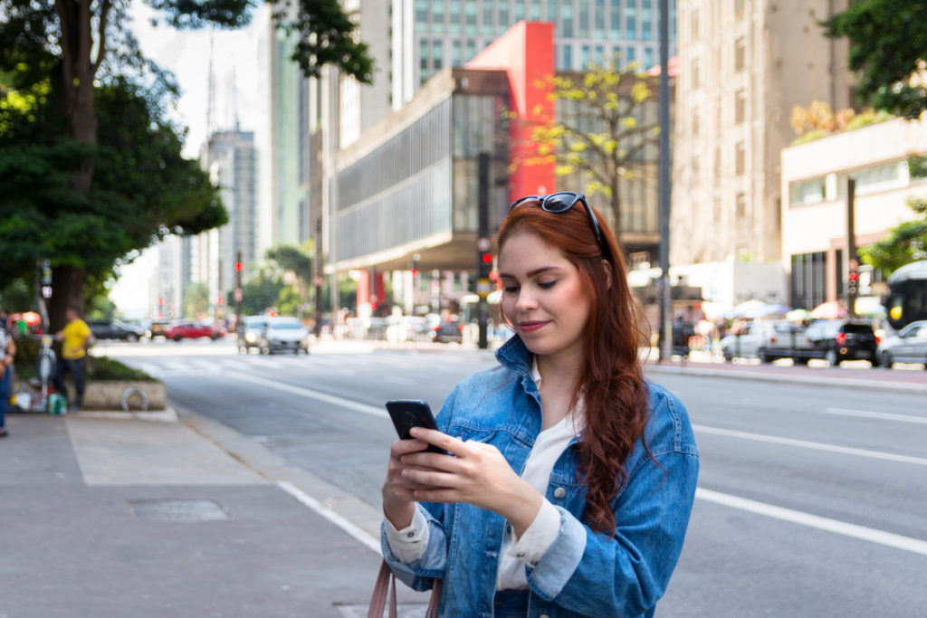 Redhead woman using a smartphone in Paulista Avenue (Avenida Paulista), Sao Paulo, Brazil