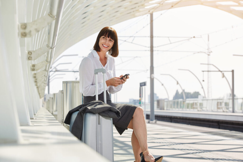 Retrato de mujer viajera de negocios con teléfono inteligente y equipaje esperando en la plataforma