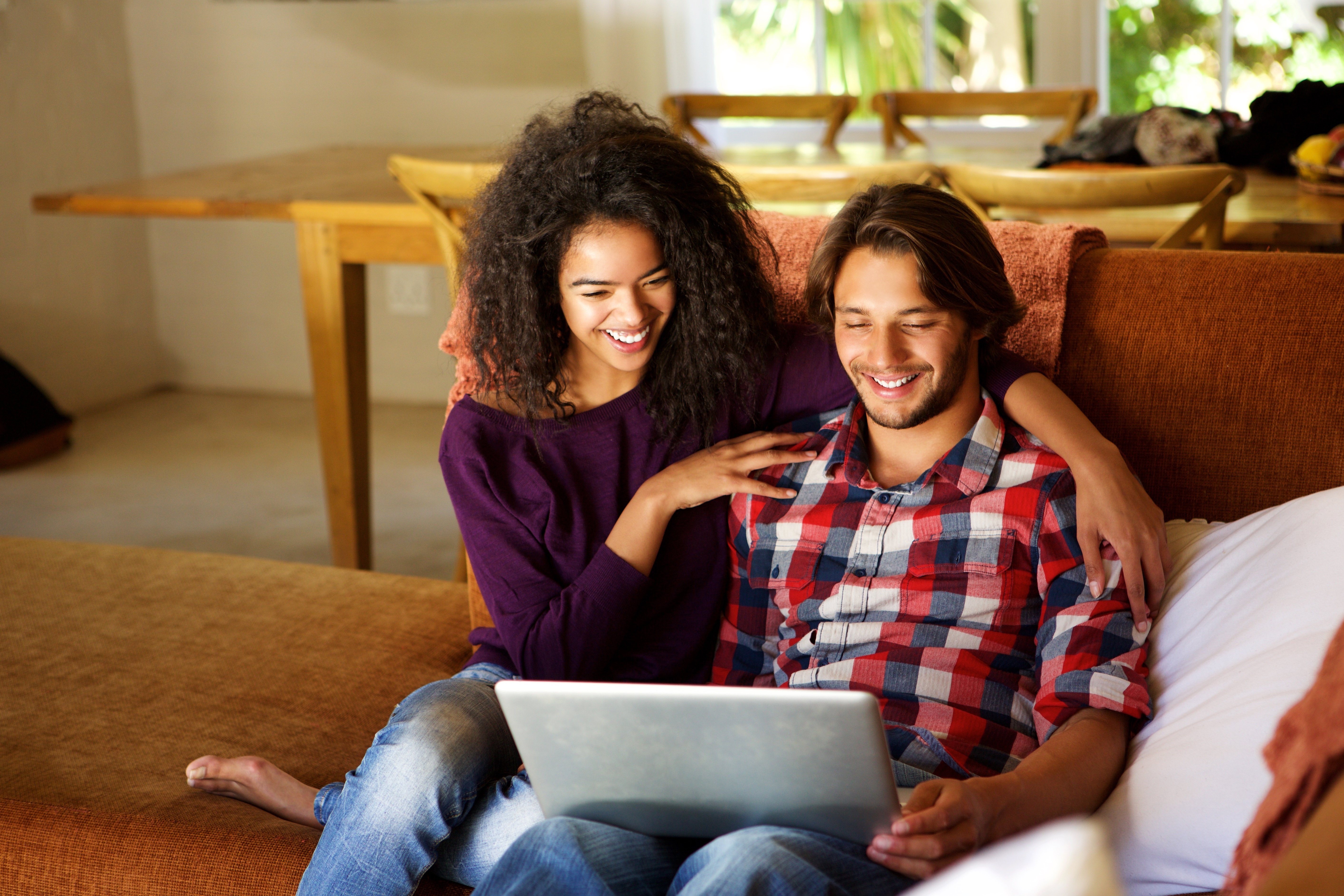 Retrato de novio y novia sentados en casa con laptop