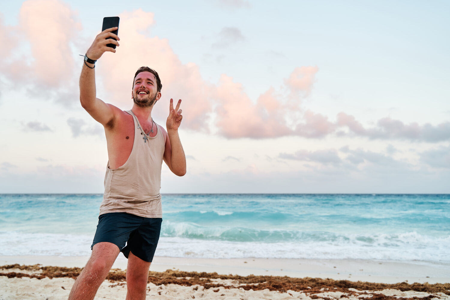 retrato de un hombre caucásico con un teléfono celular en las manos tomando una foto selfie y haciendo conejillos al atardecer en el mar de Cancún, concepto de tecnología