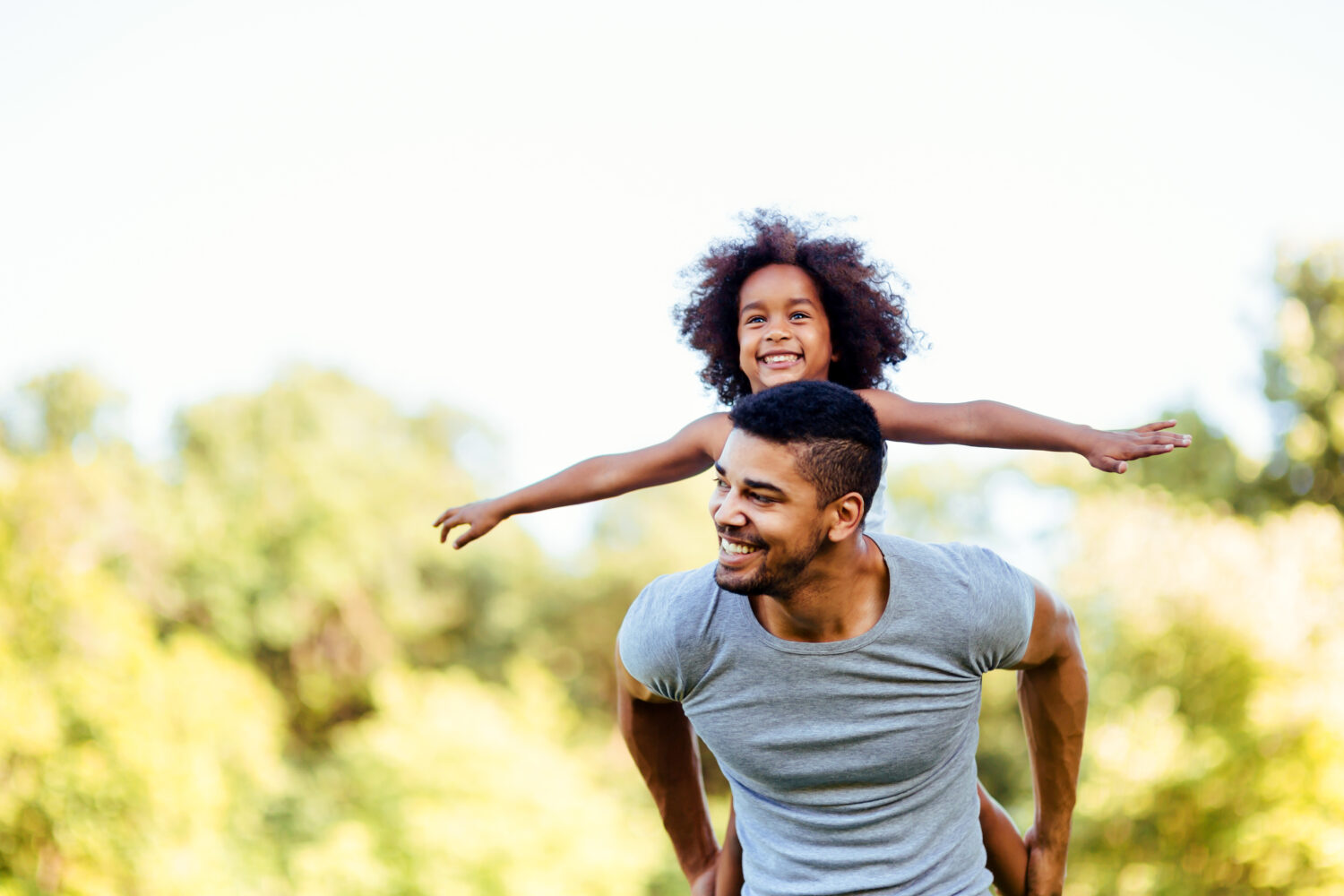 retrato de un joven padre que lleva a su hija ID: 86397 Retrato de un joven padre que lleva a su hija en la espalda
