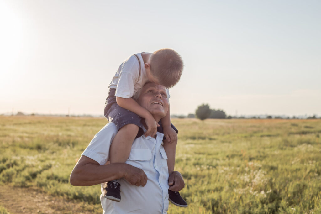 Retrato de un lindo niñito y su apuesto abuelo mirando la cámara y sonriendo en la pradera. el niño está sentado en pickaback