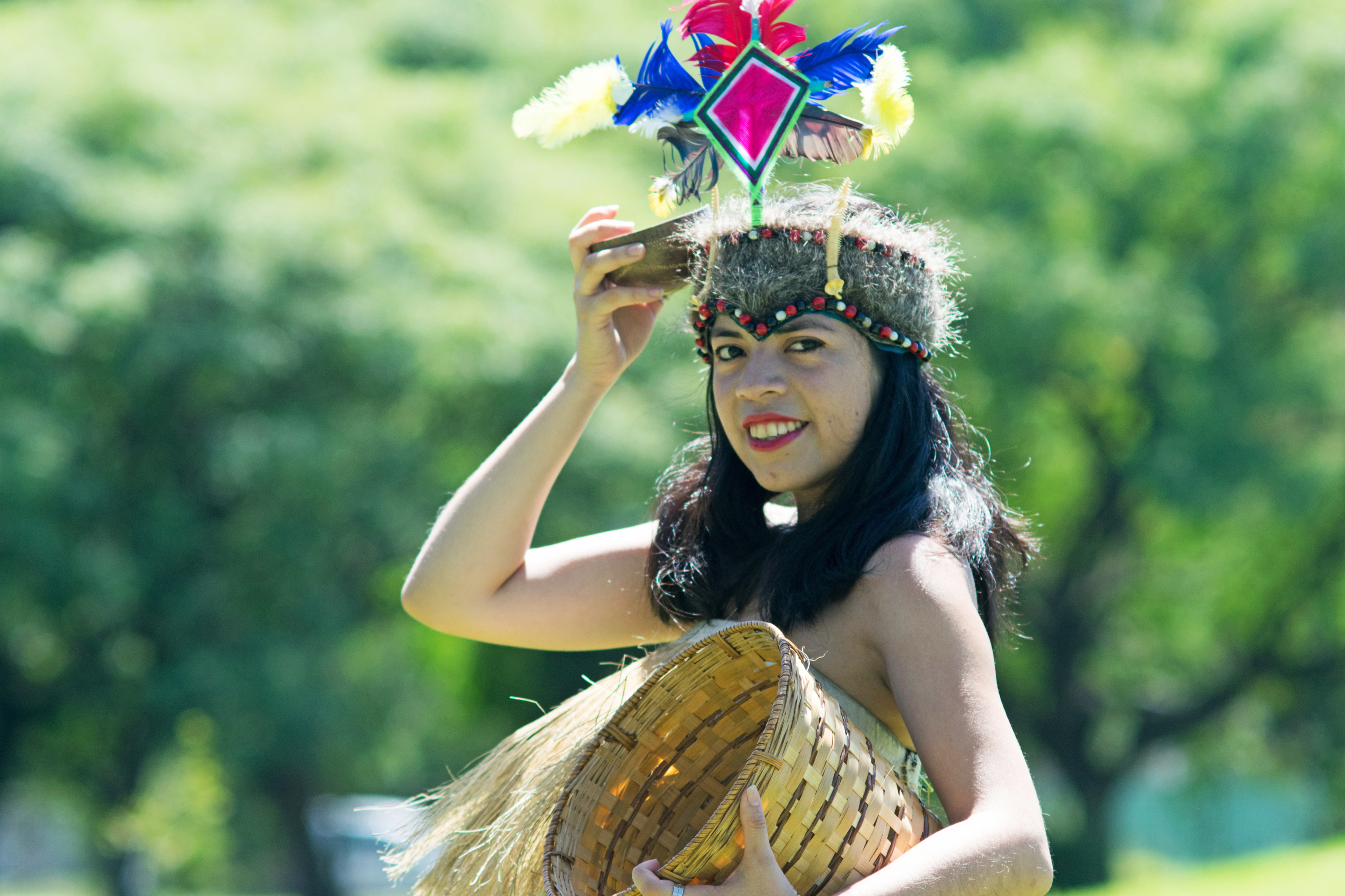 Retrato de una joven que viste la vestimenta tradicional peruana y baila danza Anaconda, un género musical típico de la región amazónica del Perú